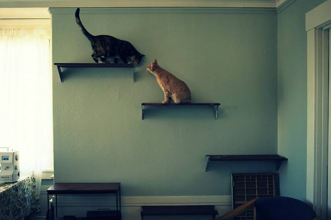 발판을 설치할 때 고양이가 편하게 걸을 수 있는지 확인해야 합니다. 그래서 발판 사이 간격은 수평으로 10~15cm, 수직으로 15~20cm 정도 띄워서 설치하는 게 좋습니다.