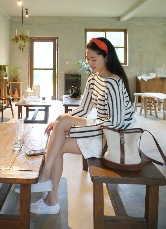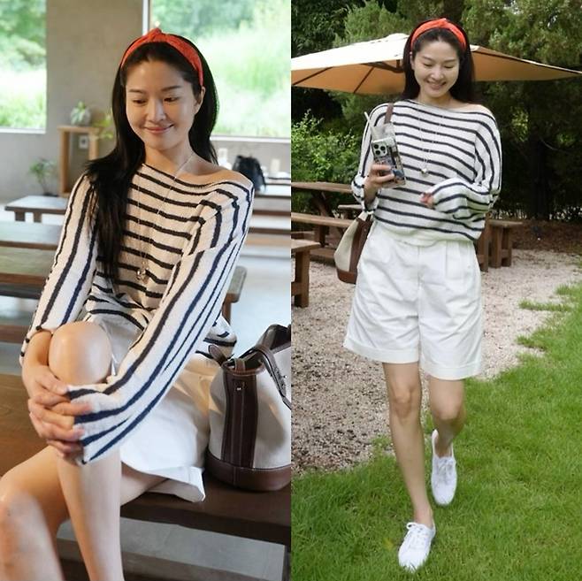 공개한 사진에서 류이서는 살짝 오프숄더로 연출된 네이비 스트라이프 패턴의 루즈핏 니트와 아이보리 컬러의 하프 팬츠를 매치해 편안하면서도 센스 있는 데이트룩을 연출했다.