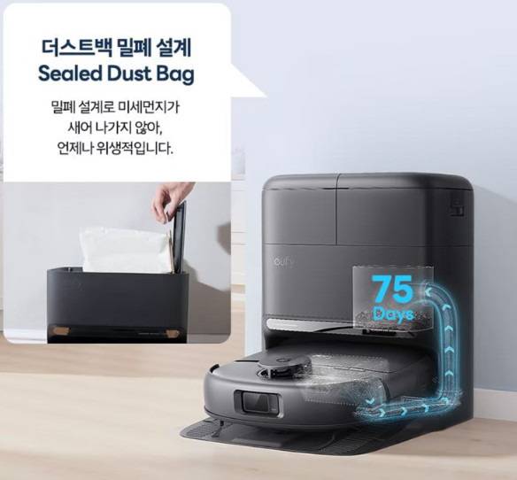 먼지 비움 역시 3L 대용량 더스트백에 자동 밀봉되는 방식으로, 최대 75일간 손댈 필요 없는 사용 경험을 제공한다. 밀폐형 더스트백 구조로 미세먼지 재비산을 줄인 점도 위생 측면에서 강점으로 꼽힌다.