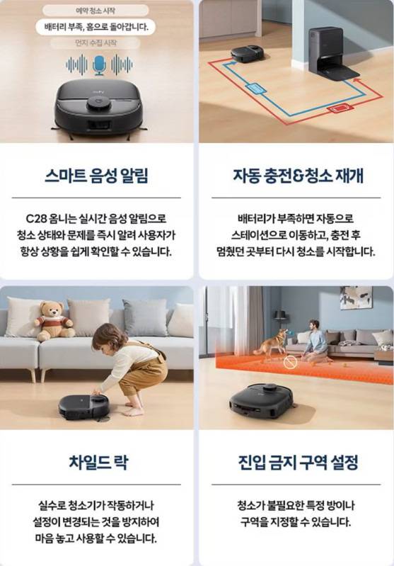 유피 옴니 C28는 실시간 음성 알림을 통해 청소 상태와 문제 상황을 바로 안내하며, 배터리가 부족하면 자동으로 스테이션으로 복귀해 충전한 뒤 멈춘 지점부터 다시 청소를 시작한다. 차일드 락 기능은 오작동이나 설정 변경을 방지하는 데 도움이 되며, 진입 금지 구역 설정을 통해 청소가 필요 없는 공간을 손쉽게 지정할 수 있다.