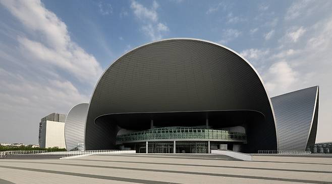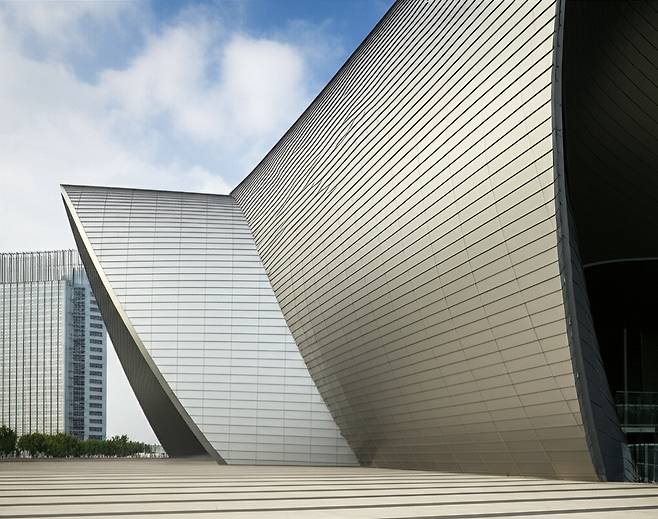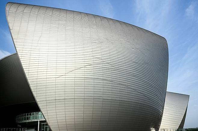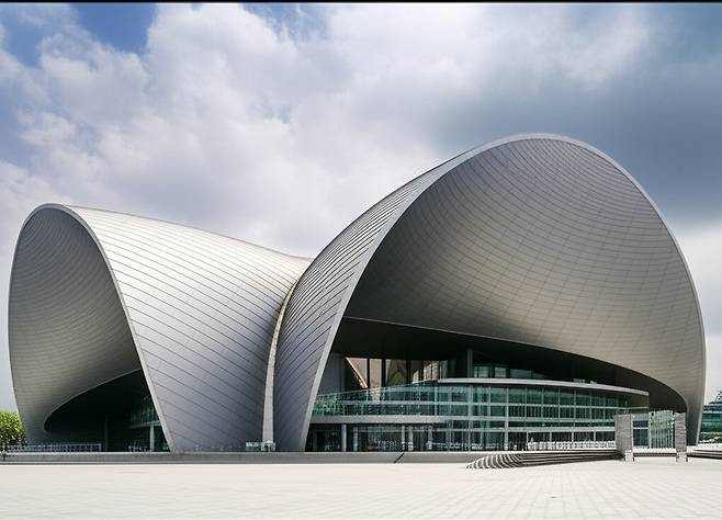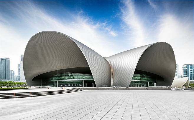 영화의전당은 그 독특한 건축 디자인만으로도 충분히 감탄을 자아냅니다. 세계 최장 캔틸레버 지붕으로 기네스북에 등재된 ‘빅루프’와 ‘스몰루프’는 영화의전당의 상징과도 같습니다. 밤이 되면 화려한 조명이 더해져 더욱 웅장하고 아름다운 모습을 자랑합니다. 건축가 볼프 D. 프릭스와 헬무트 스위진스키가 설계한 이 건물은 영화의 역동성과 미래지향적인 이미지를 담고 있습니다.