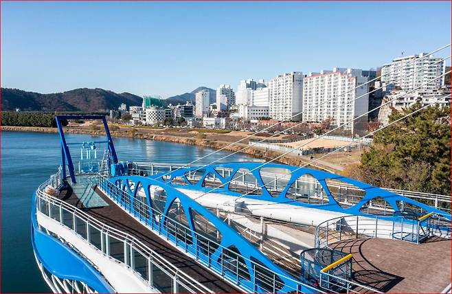 태화루 스카이워크는 울산을 상징하는 ‘고래’를 형상화한 구조물입니다. 수면 위 약 15m 높이에서 강 위로 길게 뻗어 나간 모습은 멀리서 봐도 단번에 눈에 띕니다. 길이 약 35m, 폭 20m 규모로, 하천에 교각을 세우지 않은 캔틸레버(외팔보) 구조를 적용해 태화강의 흐름을 방해하지 않도록 설계되었습니다.