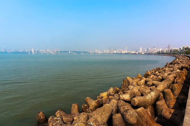 약 4.5km에 걸쳐 펼쳐진 아라비아해를 따라 이어져 있는 뭄바이 대표 해안도로인 마린드라이브는, 시민들과 관광객들이 가장 사랑하는 휴식 공간 중 하나로 사용되고 있는데요. 황금빛 해안선을 따라 이어지는 이 명소는 도심 속에서도 자연의 아름다움과 동화 같은 순간들을 선사합니다. 마린드라이브는 뭄바이의 랜드마크 중 하나로, 맑은 하늘과 함께 펼쳐진 아라비아해의 매혹적인 풍경을 즐길 수 있죠.