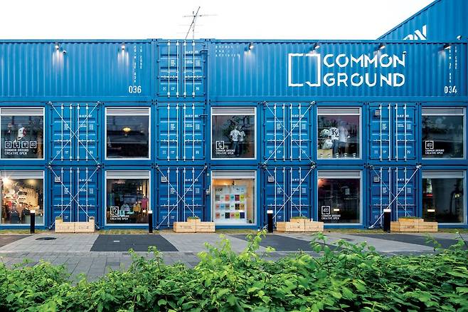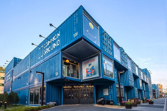 건대입구역 6번 출구로 나와 조금만 걷다 보면 선박에서나 볼 수 있는 파란 컨테이너들이 쌓여 있는 모습을 볼 수 있습니다. 바로 대형 컨테이너로 이루어진 복합문화공간, 커먼그라운드인데요.