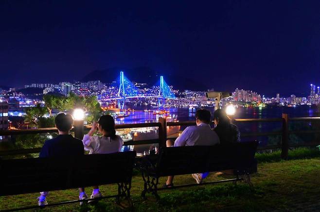 배수지 상부 특유의 개방감 덕분에 도심·항구·바다가 한 화면에 들어오고, 해 질 녘에는 연분홍빛 하늘과 LED 조명이 함께 반사돼 사진이 유독 잘 나옵니다. 특히 조명이 켜지기 시작하는 ‘첫 10분’이 가장 드라마틱하게 색이 바뀌는 시간대라 이때 자리를 잡으면 실패가 없습니다.