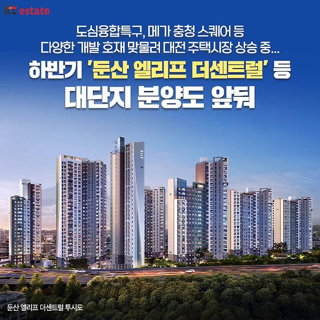 대전에서는 하반기 신규 분양도 이어지고 있습니다. 대표적으로 둔산 엘리프 더센트럴은 서구 괴정동 KT대전인재개발원 부지에 지하 3층~지상 29층, 10개 동, 총 864가구 규모로 조성되는 대단지 아파트로 11월 분양을 앞두고 있습니다. 둔산 엘리프 더센트럴은 대전에서 가장 선호하는 둔산 생활권에 인접하고 있으며, 주변에 갤러리아백화점, 롯데백화점, 이마트, 트레이더스, CGV, 대전정부청사 등 우수한 인프라가 돋보이는 곳입니다. 여기에 학원 170개 이상이 몰려 있는 둔산동 학원가를 이용하기 편리하며, 탄방역을 비롯해 갈마로, 동서대로, 대덕대로 등을 이용해 대전 시내외를 빠르게 오갈 수 있다는 장점이 있습니다.
