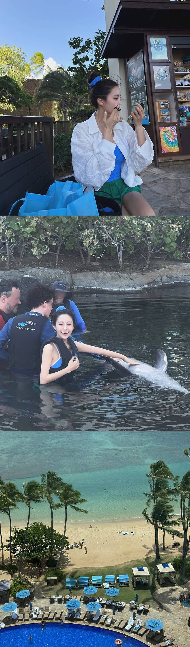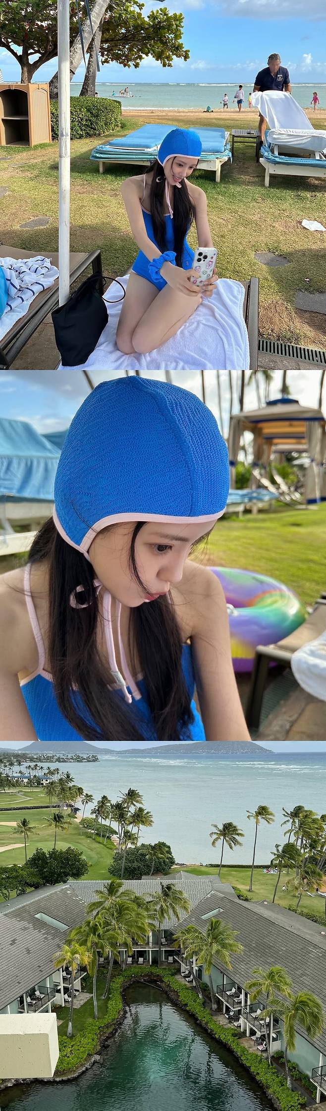 뒤이어 공개된 사진들에선 선글라스를 쓴 채 야자수 그늘 아래 걷고 있는 모습, 기념품점에서 대형 헬로키티 인형을 품에 안고 웃고 있는 장면, 그리고 파란 수영모에 수영복까지 맞춰 입고 해변 셀카를 찍는 장면까지. 여행이란 게 원래 누리는 사람만큼 보는 사람도 기분이 좋아지게 하는 법인데, 이번 사진들이 딱 그랬다.