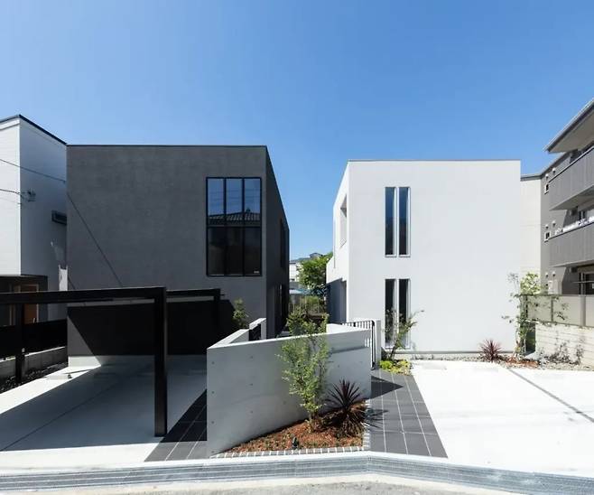 부모 세대의 집이 밝은 흰색이라면, 자녀 세대의 집은 깊이 있는 검은색입니다. 처음 보면 주택보다는 작은 갤러리나 조용한 카페 같은 느낌을 줍니다.