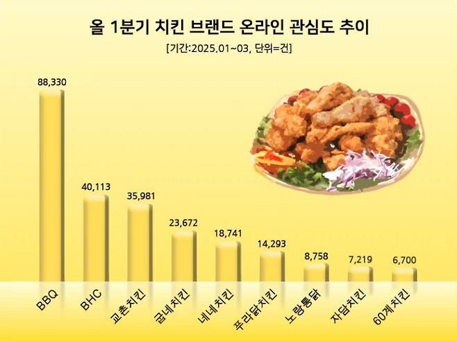 이어 BHC가 총 4만113건의 온라인 포스팅 수로 관심도 2위에 올랐다.굽네치킨 2만3672건, 네네치킨 1만8741건, 푸라닭치킨 1만4293건, 노랑통닭 8758건, 자담치킨 7219건, 60계치킨 6700건으로 뒤를 이었다.