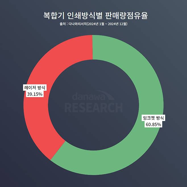 복합기 전체에서는 잉크젯 방식이 60.85%로 39.15%인 레이저 방식보다 점유율이 많다. 얼핏 잉크젯 방식은 인쇄를 자주 하지 않으면 카트리지의 노즐이 막히는 현상이 빈번히 발생하기 때문에 학부모들에게 선택받지 않을 것이라 유추할 수 있지만, 그 예상은 보기 좋게 빗나갔다. 그만큼 인쇄 빈도가 많은 것으로도 해석할 수 있다. 하지만, 잉크젯 방식 복합기는 레이저 방식보다 선명하고 깔끔한 인쇄가 가능하고 기기의 부피가 작다는 장점도 분명 존재한다. 또한, 잉크 카트리지 비용이 레이저 방식 복합기의 토너보다 저렴하다. 하여 인쇄 속도가 빠르고 용지 한 장당 인쇄 비용이 적은 레이저보다 소비자들에게 더 매력적으로 다가갈 것으로 생각한다.