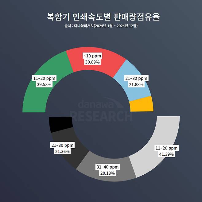 컬러를 지원하는 복합기의 인쇄 속도는 11~20 ppm 제품이 39.58%로 가장 높았다. 그 뒤를 10 ppm 대가 30.89%, 21~30ppm 제품이 21.88%로 뒤따르는 모습이다. 흑백 복합기에서도 11~20 ppm 인쇄 속도를 지원하는 제품이 41.39%로 제일 많고 31~40ppm이 38.13%, 21~30ppm 21.36% 순으로 랭크되었다. 역시 컬러 인쇄보다는 흑백 인쇄 속도가 빨라서 문서만 주로 뽑는 사람에게 어필되는 부분이다. 복합기의 인쇄 속도에 별로 개의치 않는 소비자들은 11~20 ppm 제품을 선택하면 되겠다.