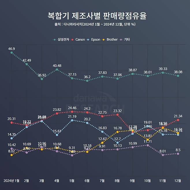 제조사는 삼성전자가 38%대 판매량 점유율로 압도적 1위다. 그 나머지 점유율을 가지고 캐논, 앱손, 브라더 등이 다투는 형국이다. 만년 2위는 캐논이다. 10월에 잠시 휘청하며 엡손에게 자리를 내준 적이 있지만, 이내 회복하여 21.34%로 마감했다. 살짝 혼란한 상황에서 3위권이었던 브라더가 소폭 상승하여 16.34%로 2위를 차지해 버렸다. 덕분에 엡손은 근소한 차이로 3위로 2024년을 마감했다. 참고로 삼성전자 복합기는 거의 모두 제조사와 수입업자가 HPPK(HP프린팅코리아)라고 표시된다. 2017년 삼성전자가 프린터, 복합기 사업을 HP에 매각한 결과다. 삼성 프린터라는 이름과 제품은 동일하지만, 진정한 제조사는 HP 임을 꼭 참고하자.