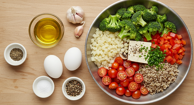 - 중간 크기의 그릇에 계란을 풀어준 다음, 조리된 채소, 두부, 통곡물을 넣고 섞어줍니다.