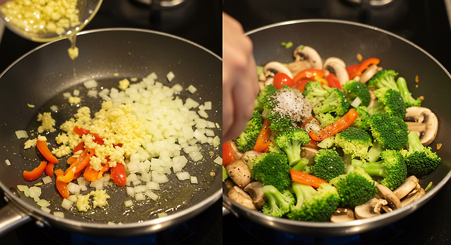 - 논스틱 팬에 카놀라유를 중간 불로 가열한 후, 마늘, 양파, 피망, 브로콜리, 버섯, 후추, 소금을 넣고 5분간 또는 부드러워질 때까지 조리합니다.
