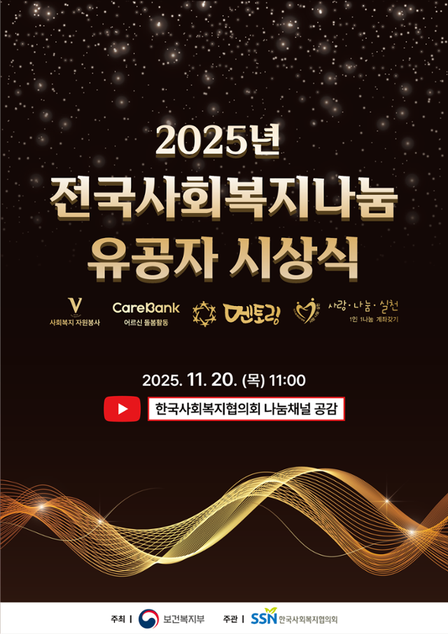 보건복지부(장관 정은경)와 한국사회복지협의회(회장 김성이)는 오는 20일 서울 용산구 전쟁기념관 피스앤파크컨벤션 로얄홀에서‘2025년 전국사회복지나눔 유공자 시상식’을 개최하고, 한 해 동안 사회복지 증진과 나눔문화 확산에 기여한 개인 및 단체 114명의 공로를 기린다.