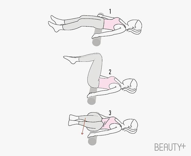 1 바닥에 폼롤러를 가로로 놓은 채 그 위에 엉덩이를 올리고 천천히 눕는다. 양손은 옆으로 펼쳐 폼롤러를 잡는다. 바닥에 폼롤러를 가로로 놓은 채 그 위에 엉덩이를 올리고 천천히 눕는다. 양손은 옆으로 펼쳐 폼롤러를 잡는다.