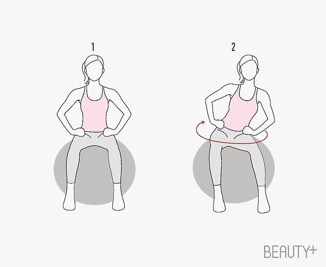 2 손을 골반에 가볍게 올려 균형을 잡고 오른쪽으로 원을 그리듯 천천히 돌려준다. 골반기저근이 짐볼과 닿는 느낌에 집중하며 진행해야 효과가 높다.