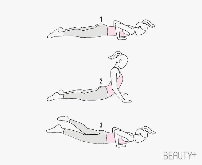 3 호흡을 내쉬고 상체를 천천히 바닥으로 내리며 다리를 뒤로 높이 올린다. 다시 바닥을 손으로 밀어 2번 자세처럼 상체를 올렸다가 내리며 시소가 움직이듯 반복한다.
