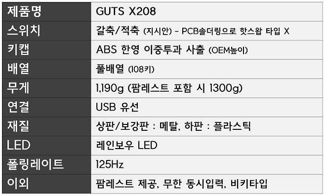 구성품으로는 GUTS X208 본체와 설명서, 키캡리무버 그리고 팜레스트가 들어 있습니다.