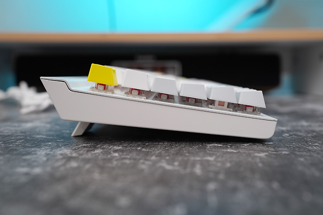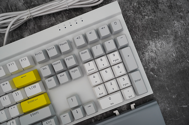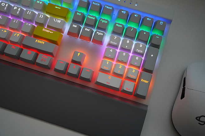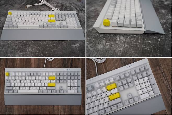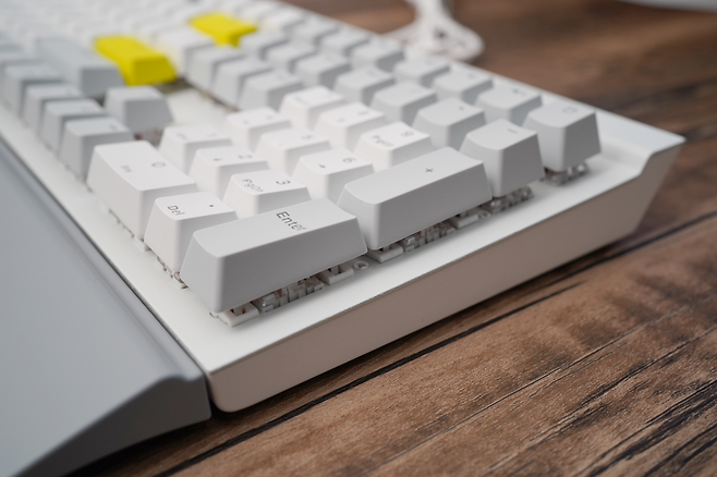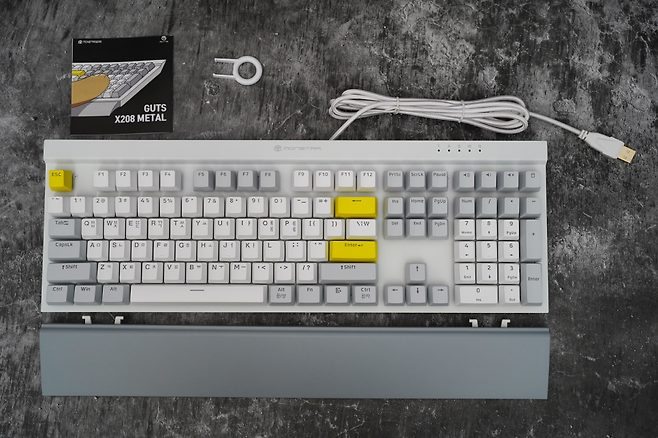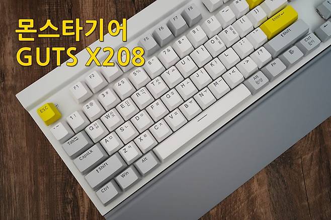 GUTS X208은 화이트와 그레이, 옐로우 포인트가 조합되어 전체적으로 깔끔한 색상 조합을 보여주는 것 같습니다. 무엇보다도 팜레스트가 있어 손목을 편하게 해주는 점, 비키 타입으로 청소가 용이한 점 등 키보드를 사용, 관리하는 데에 편리한 사항들이 녹여져 있는 제품입니다. 근래 출시되는 기계식 키보드의 트렌드와는 다소 거리가 있는 모습이지만 풀배열의 키보드가 필요한 사람들에겐 적절한 만족감을 줄 것으로 생각됩니다. 그럼 GUTS X208에 리뷰를 마치도록 하겠습니다. 감사합니다.