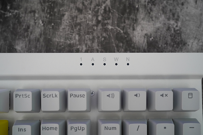 인디게이터는 NUM PAD 상단에 위치하고 있습니다. 좌측부터 NUM, 캡스락, 스크롤락, 윈도우락, 무한동시입력 상태입니다.
