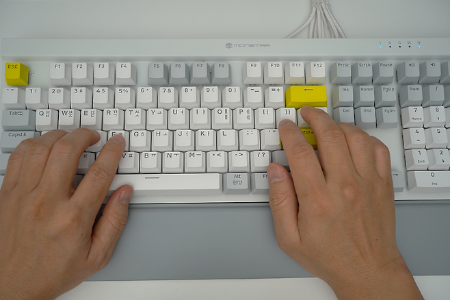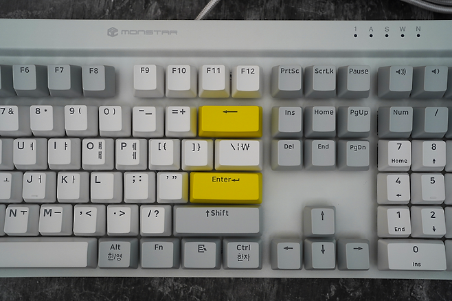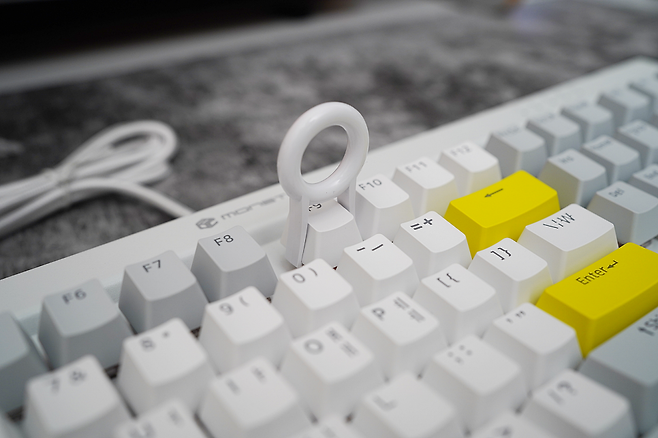 모디열은 회색의 키캡으로 문자열은 화이트로 디자인되어 있으며 노랑색으로 ESC, ENTER, BACK SPACE 에 포인트를 주었습니다. 상판은 메탈 재질로 되어 있고 연한 그레이로 도장처리가 되어 있어 깔끔합니다.