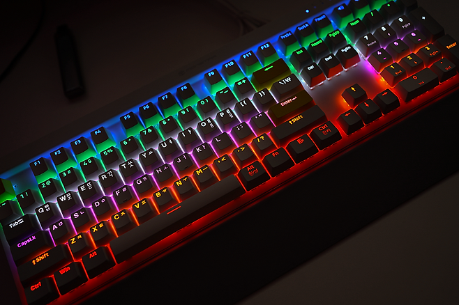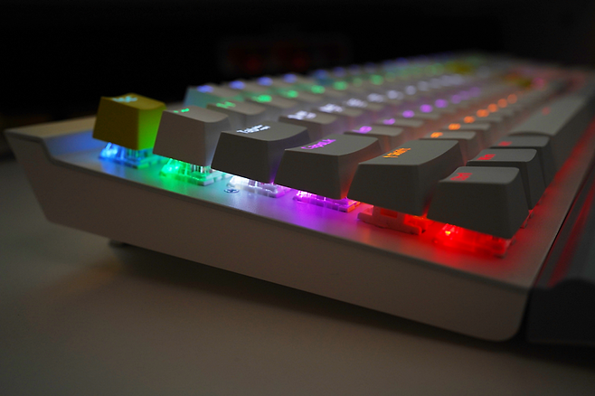 LED는 기계식키보드 초창기 시절, 보급형 키보드에서 많이 쓰였던 레인보우 형태입니다. 처음에는 굉장히 멋져 보이다가도 RGB LED에 이숙해질 무렵 촌스러워 보이기도 했는데 이렇게 몇 년만에 다시금 보니 또 많이 괜찮아 보이는 것 같습니다. 밝은 색상의 하우징에 밝게 빛나는 광원이라 생각보다 훨씬 실물이 예쁘게 보입니다.