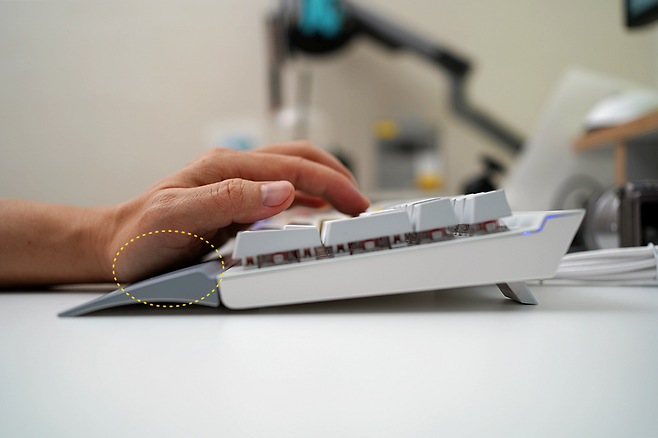 팜레스트를 조립한 모습입니다. 위 사진에서 보듯이 손바닥 부분을 받쳐주기 때문에 장시간 사용하더라도 손목이나 손바닥에 무리가 가지 않게 됩니다. 항상 키보드를 쓸 때에는 팜레스트를 사용하곤 하는데 이렇게 일체형 키보드일 경우에는 순정을 사용하는 것이 좋다고 생각되네요.