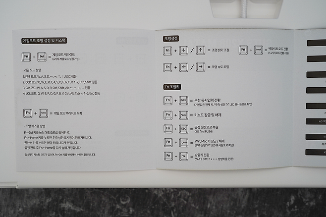 설명서에는 LED 제어 효과와 FN키와 조합하여 사용할 수 있는 기능들이 나와 있습니다. 상품 안내 페이지에도 LED 변경 방법이 나와 있지 않기 때문에 설명서는 따로 구비해 두는 것을 추천드립니다.
