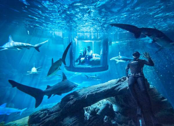 수면으로부터 약 10m 아래에 위치해 있는 이 수중호텔은 벽면전체가 통유리로 되어있어, 수족관을 배회하는 상어들을 눈앞에서 구경이 가능한데요.