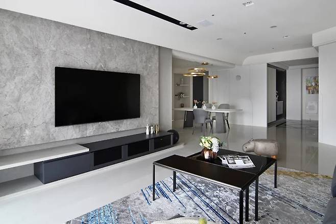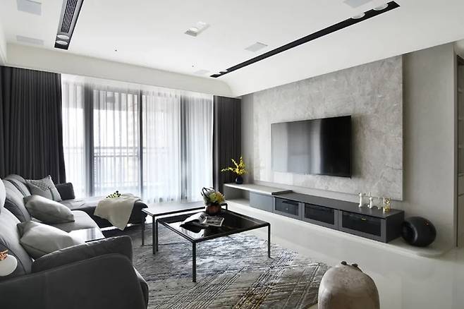 부드러운 곡선의 천장은 공간을 더 넓어 보이게 하고, 숨겨진 조명과 수직 구조물 속 H형 철재는 깊이감을 더한다. 회색 무광으로 마감된 TV 벽면은 석재와 블랙 글라스 캐비닛이 층을 이루며 기술적 세련미와 깔끔한 미학을 함께 보여준다.
