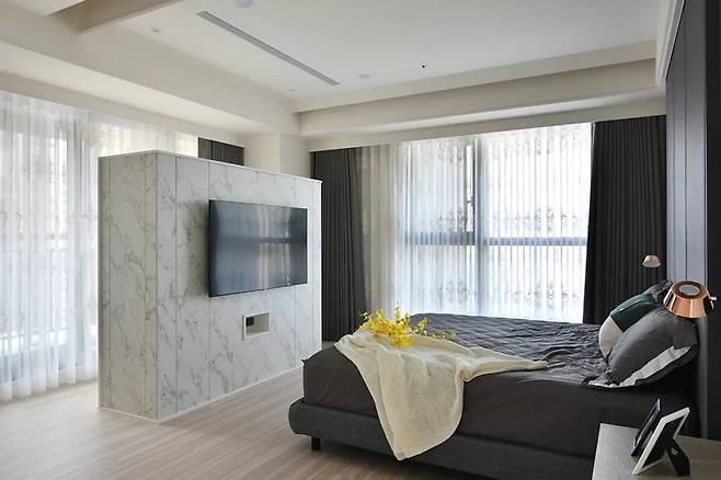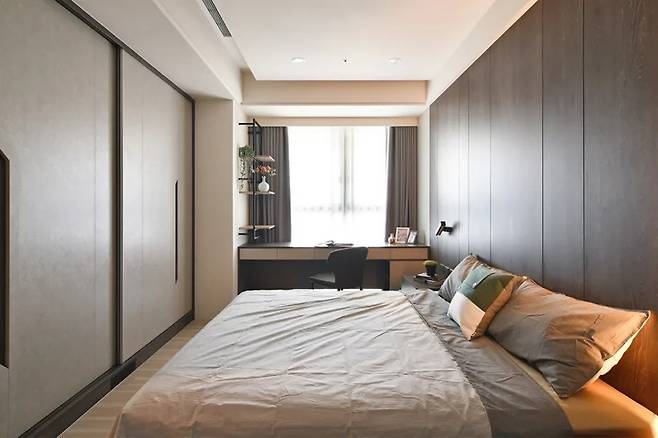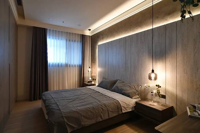 침대 머리맡은 회색과 파랑의 조화로 부드러운 리듬을 형성하고, 수납장은 남녀의 취향을 반영하여 실용성과 아름다움을 동시에 만족시킨다. 편안하게 머물기 좋은 온기가 있는 공간이다.