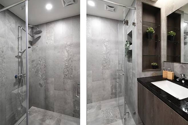 각기 다른 스타일로 설계된 세 개의 욕실은 각 공간에 독특한 매력을 부여한다. 메인 욕실은 자연석 무늬로 호텔 분위기를 연출하며, 아들의 욕실은 콘크리트 텍스처와 직선적인 타일 배열로 통일된 미학을 완성했다. 공용 욕실은 산업적 무드를 강조하는 다크 그레이와 블랙 포인트가 인상적이다.