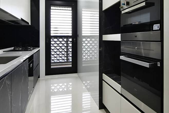 대리석 패턴과 가죽 텍스처의 시스템 보드를 활용한 주방은 시각적으로 무게감을 분산시킨다. 이중 수납 방식을 통해 전자제품을 감추고 수납 효율을 높였으며, 인접 공간과의 유기적 연결도 놓치지 않았다. 스틸 키친타일과 블랙&화이트 조합은 세련미와 실용성을 겸비했다.