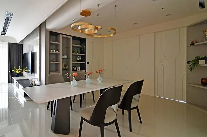 다이닝 공간은 티탄 조명의 반짝임 아래 감성적으로 디자인되었다. 천장선과 이어지는 반복적인 선들은 거실과의 연결성을 강조한다.