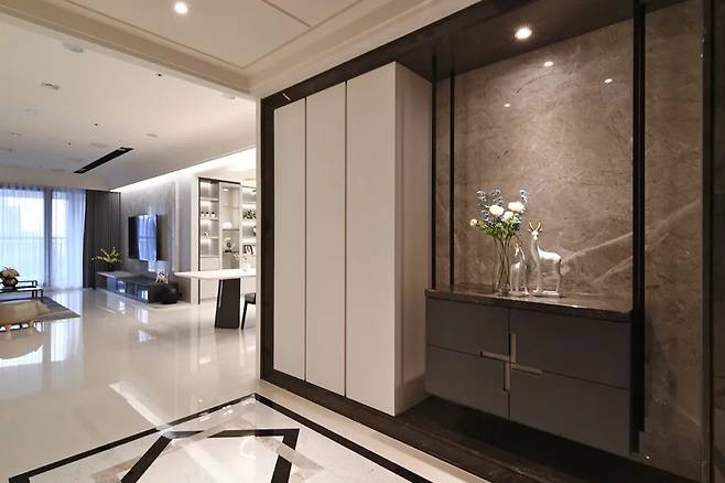 입구에 들어서면 마치 호텔 로비에 발을 들인 듯한 인상이 강하게 다가온다. 폭이 2.8미터에 이르는 넓은 현관은 블랙 프레임과 공중에 떠 있는 수납장이 45도 각도로 빛을 받아 시선을 사로잡는다.