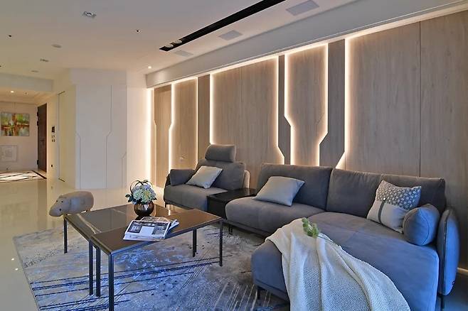 소파 뒤편의 나무 벽면은 세 겹의 목재로 입체감을 주어 자연스럽게 시선을 위아래로 이끈다. 전체 인테리어가 하나의 조화로운 건축물처럼 느껴진다.