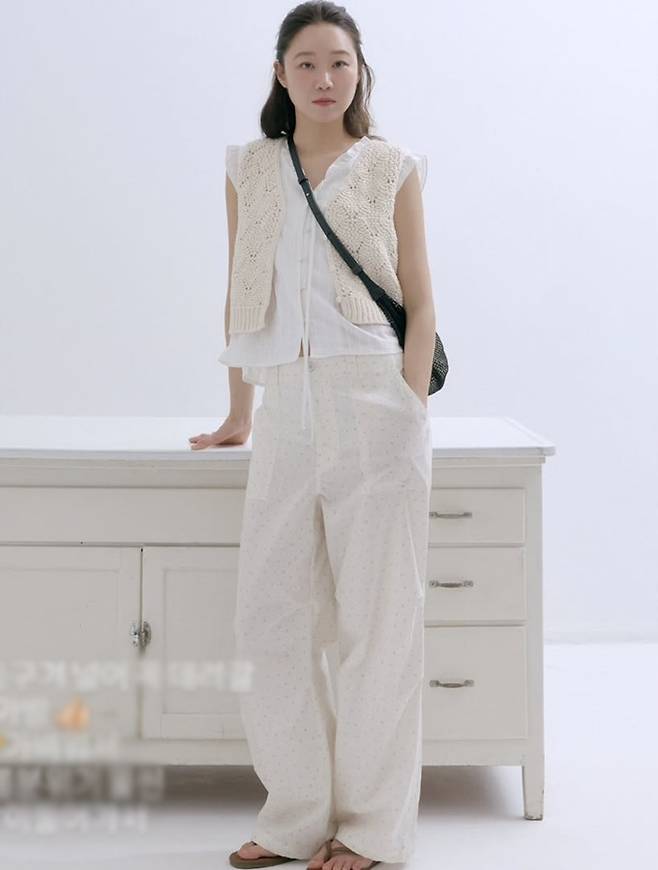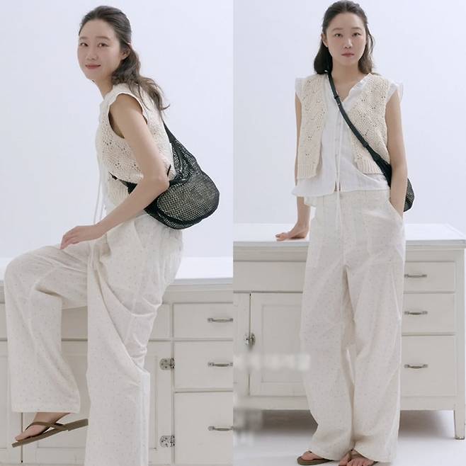 공개한 사진에서 공효진은 도트 무늬가 은은하게 디자인된 아이보리 팬츠와 민소매 화이트 끈 조끼에 위에 크로셰 크롭 조끼를 레이어드한 스타일로 캐주얼하면서도 자연스러운 미모를 선보였다.