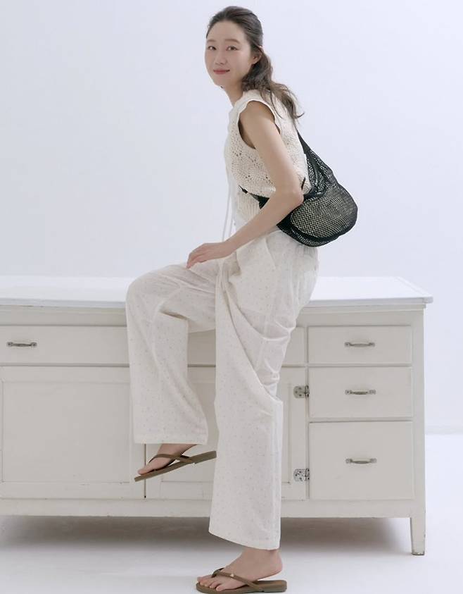 여기에 그물백을 매치해 시원한 여름 스타일을 완성했다.