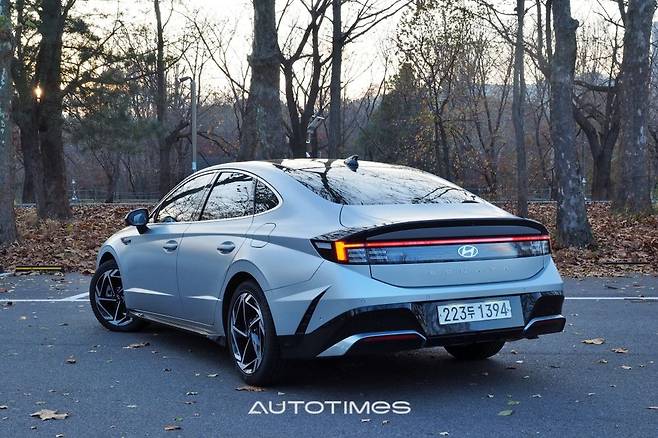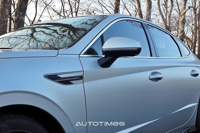 옆은 크게 건드리지 않았다. 낮게 시작하는 프런트 엔드와 긴 후드, 매끈한 루프라인까지 기존과 같다. 희미하게 사라지는 유연한 캐릭터라인과 사이드미러, 각 필러의 형태도 동일한데 기존 쏘나타의 디자인 완성도가 높아 불만이 없다. 이 외에 바람개비 모양의 휠과 펜더 장식은 신형다운 이미지를 강조한다.
