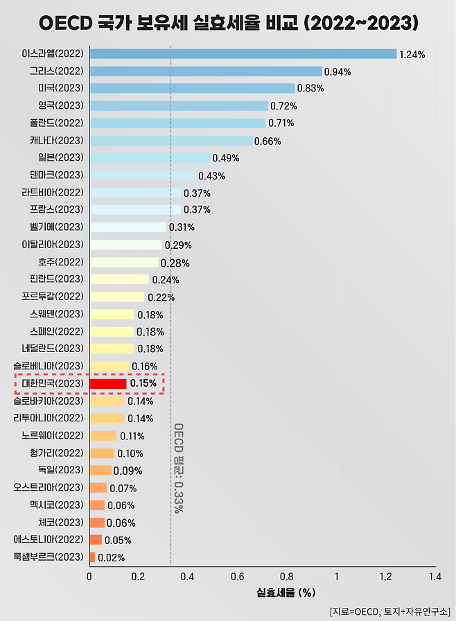 A. 한국의 보유세 실효세율은 약 0.15% 수준으로 OECD 주요국 평균인 0.6%에 비해 턱없이 낮다. 미국의 경우 평균 1%(뉴저지 최대 2.5%)에 달하며 영국(0.72%), 일본(0.49%)과 비교해도 한국은 최소 3~4배 이상 낮은 수준이다.