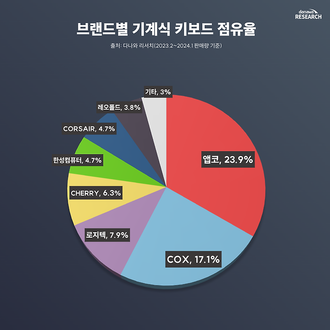 다나와 리서치에 따르면, 지난 1년 동안 가장 많은 기계식 키보드를 판매한 것은 앱코였다. HACKER K515(37,900원)을 포함해 2~3만 원대 기계식 키보드가 다수 판매되면서 높은 점유율을 기록했다. 2위는 COX. 신제품이 많지는 않지만 앱코와 비슷하게 보급형 기계식 키보드 위주로 많은 선택을 받았다.