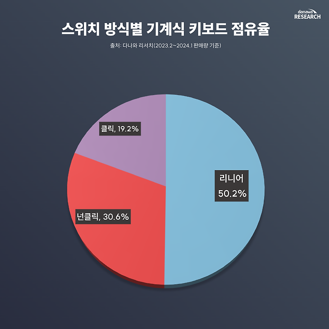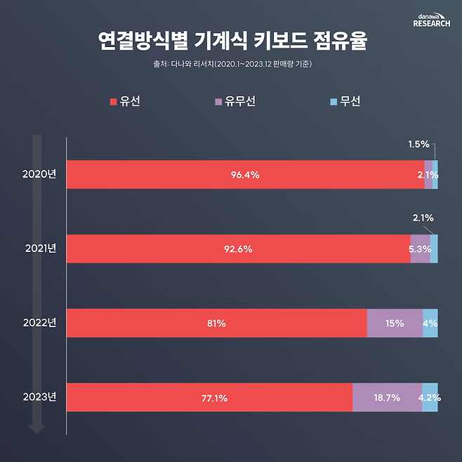다나와 리서치에 따르면 2020년부터 매해 유선 제품의 점유율은 줄어드는 중이다. 점유율이 크게 늘어난 이유는 '가격의 하락'과 '제품의 증가'를 꼽을 수 있다. 2∼3년 전만 해도 기계식 키보드는 대부분 유선 제품 위주였으며, 유·무선 및 무선 기계식은 가격대가 높고 제품의 수도 많지 않았다. 하지만 점점 저렴해지고 다양한 업체에서 무선 기능을 탑재한 기계식 키보드를 선보이면서 현재는 2만 원대에도 퀄리티가 괜찮은 제품을 구매할 수 있게 되었다.