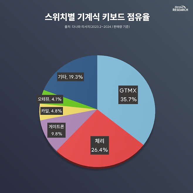 기계식 키보드의 핵심, 스위치. 점유율 1위는 GTMX로, 이를 탑재한 3만 원대 보급형 기계식 키보드가 많이 팔리면서 1위를 달성했다. GTMX는 중국의 스위치 제조사인 GAOTE(둥관 고택 전자 유한회사)가 만든 스위치다. 내구성과 관련된 문제가 불거지긴 하지만, 단가가 체리나 카일 등의 타 스위치보다 낮다 보니 오테뮤 스위치와 함께 2-4만 원대 저렴한 기계식 키보드가 주로 탑재한다. 참고로 GAOTE는 점유율 5위의 오테뮤 스위치도 함께 생산하고 있다.