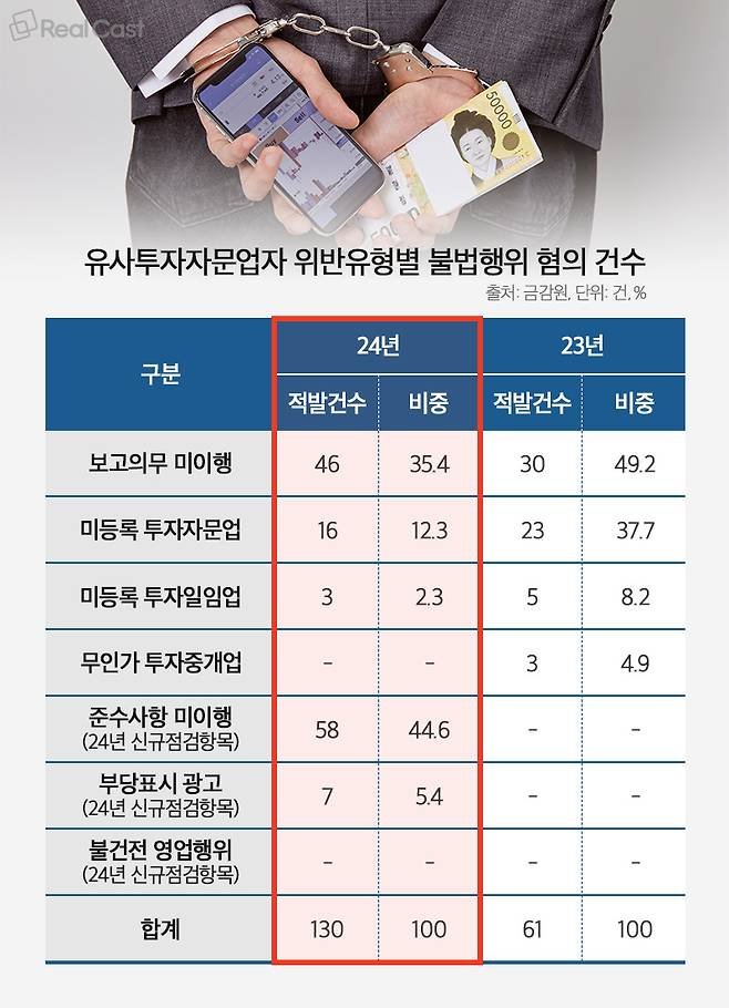 이는 2023년에는 58개 사가 61건의 위법 혐의가 적발됐는데 이보다 두 배 이상 늘어난 수준입니다. 위반 유형별로는 준수사항 미이행이 58건(44.6%)으로 가장 많았으며, 보고의무 미이행 46건(35.4%), 미등록 투자자문업 16건(12.3%), 부당표시 광고 7건(5.4%)순이었습니다.