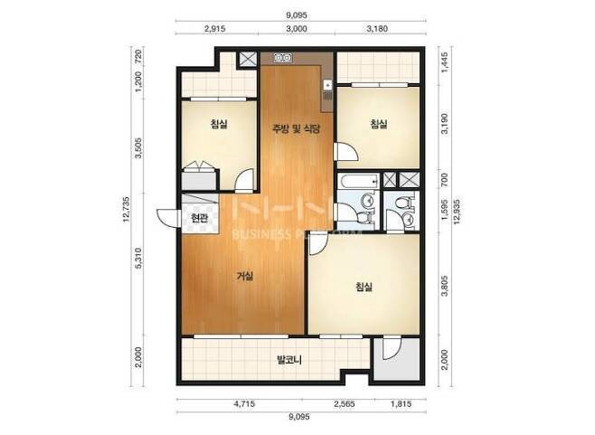 이 집은 방 3개와 2개의 화장실로 구성된 30평대 집이에요.