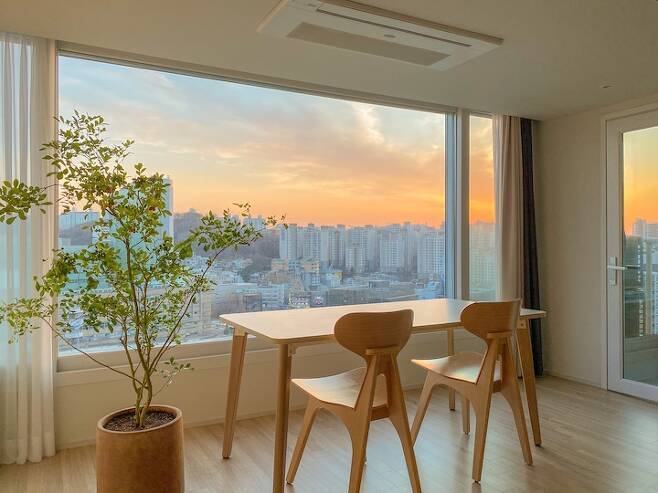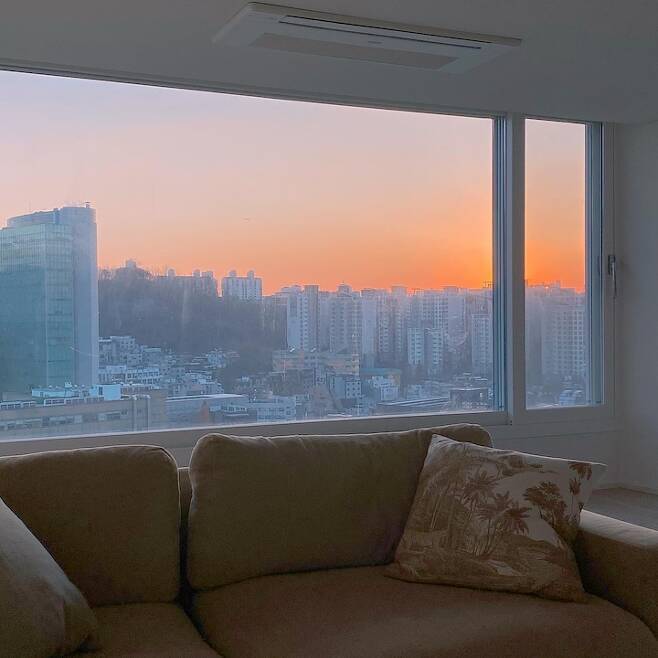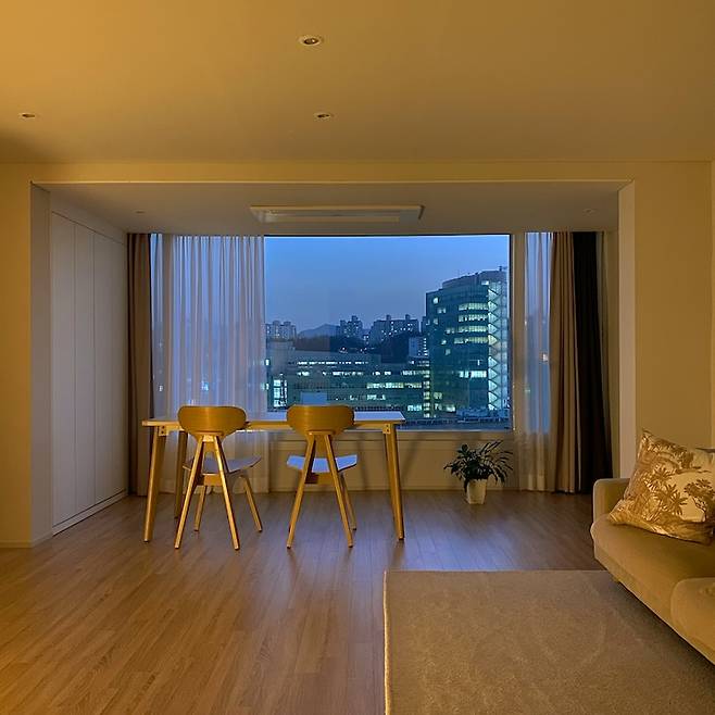 그렇게 찾은 지금의 집입니다. 지대가 조금 높은 곳입니다. 거실 앞쪽은 시원하게 뻥 뚫려있고 남향이라 하루 종일 해가 참 밝아요. 날씨가 좋은 날엔 멋진 노을 감상도 가능합니다. 해질 무렵 앞 건물이 조명을 켜면 화려해진 시티 뷰를 볼 수 있어요.