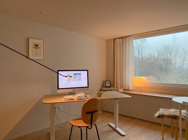 거실의 반대편인 작업실에서는 사계절 다른 모습을 보여주는 숲을 창문 가득 볼 수 있어요. 이사 와서 그 숲길을 따라 산책하는 일이 많아졌습니다. 인테리어처럼 고쳐서 될 수 없는 부분이 조망권이고, 조금은 제한적이겠지만 그렇기 때문에 더 희소가치가 있는 요소로, 인테리어에서 ‘뷰’가 가지는 역할도 중요한 포인트가 될 것 같습니다.