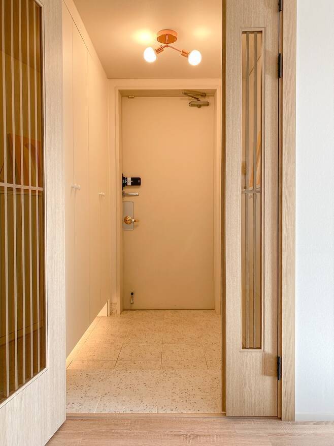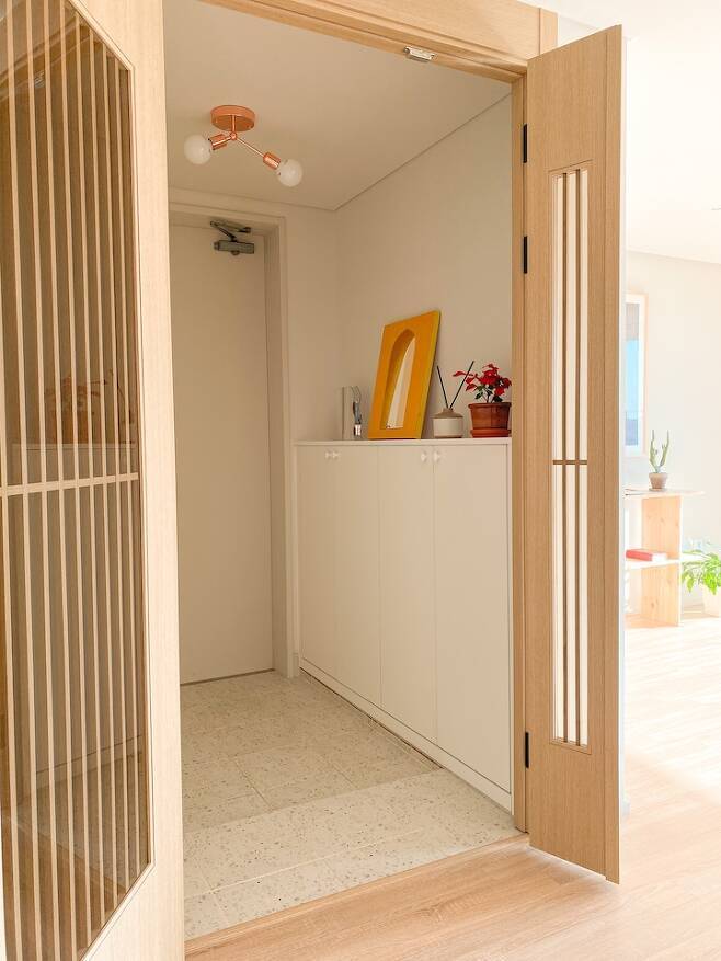 현관부터 차근차근 소개해 볼게요. 기존에는 현관을 열고 들어오면 정면에서 화장실이 바로 보이는 구조였어요. 그래서 그걸 피하기 위해 중문을 설치했어요.