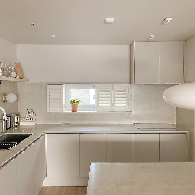 화이트+우드 주방은 이미 해봤으니, 이번에는 조금 다른 느낌으로 무광의 마블이 돋보이는 샌드그레이 톤의 주방입니다. 낮에는 베이지 톤이었다가 저녁 무렵이 되면 묘하게 그레이 톤으로 변하는 매력적인 색상이에요.